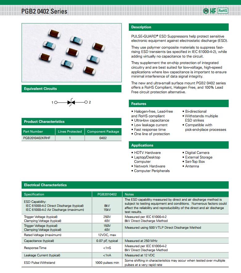 產(chǎn)品名稱: PGB20402 系列 - 0402無(wú)鉛表面貼裝型聚合物ESD抑制器