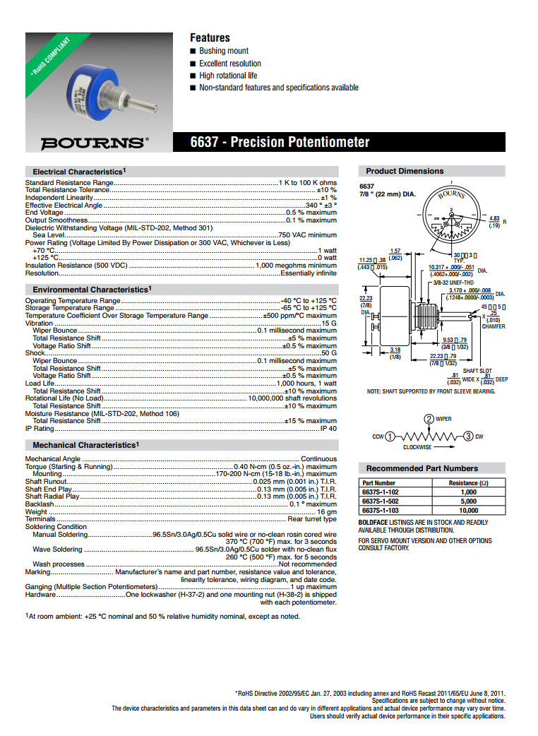 簡述: BOURNS單轉(zhuǎn)型精密電位器6637
