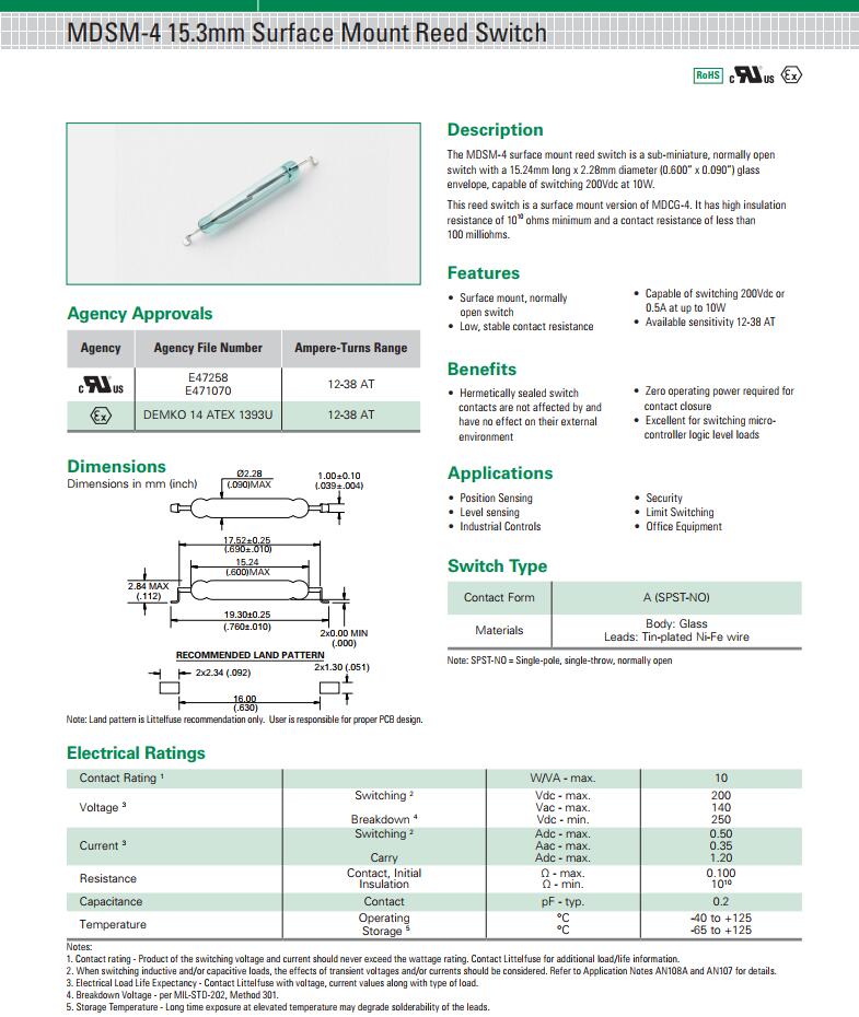 產(chǎn)品名稱: MDSM-4 系列 - 15.3mm表面貼裝磁簧開關(guān)|HAMLIN|干簧管