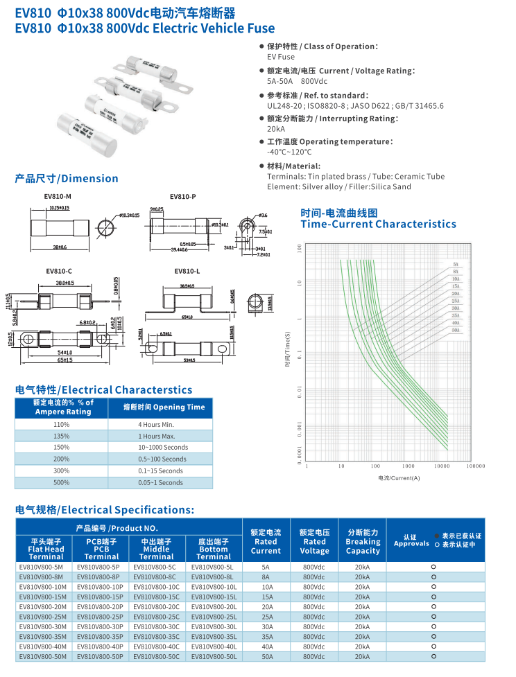 簡述: 電動汽車熔斷器EV810 10*38 800VDC Electric Vehicle Fuse