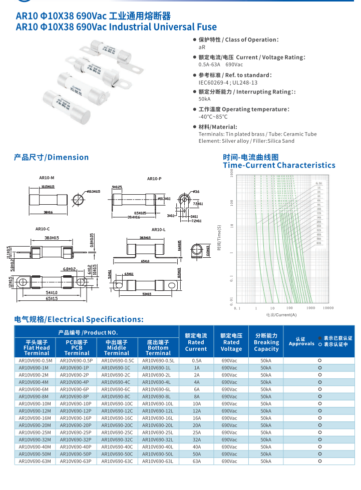 產(chǎn)品名稱: 工業(yè)通用熔斷器 AR10 10*38 690VAC INDUSTRIAL Universal Fuse